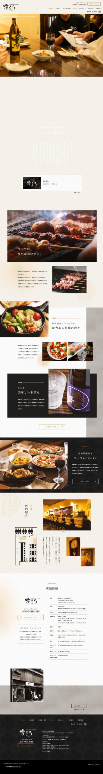 - 焼き鳥を中心とした料理へのこだわりを伝え、利用シーンと絡めつつ空間の使いやすさを見せることで、新規のお客様のご来店に繋げられるよう制作しました。 またHPで集客を図ることで、送客手数料削減も目指しています。