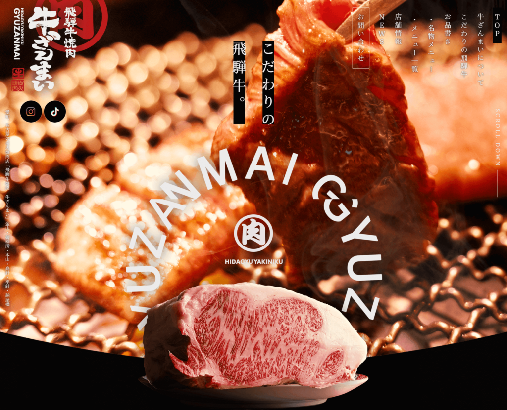 黒毛和牛の「飛騨牛」のアップの画像を大きく使用し、肉の持つ高いクオリティとシズル感を直感的に伝えています。