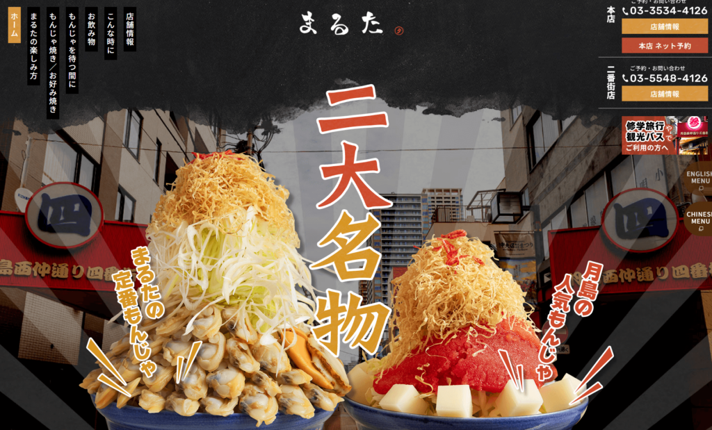 「まるたの二大名物」を掲げたもんじゃ焼き・お好み焼きのビジュアルで食欲をそそります。