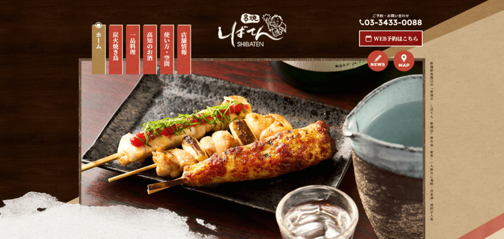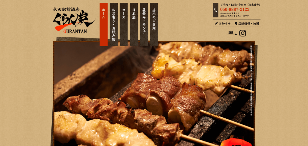「屋台風酒場」をコンセプトに、串焼きや日本酒の写真を多用し、賑わいのある雰囲気を強調。