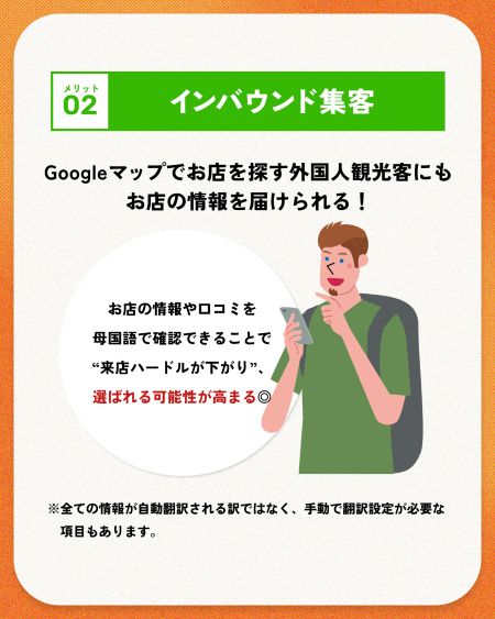 Googleビジネスプロフィールをしっかり設定しておけば、海外の方にもお店の情報を的確に届けることができます。一部の項目は手動での翻訳設定が必要な場合もありますが、お店の情報や口コミを母国語で確認できることで、外国人観光客にとっての来店ハードルが大きく下がり、周辺のお店の中から選ばれる可能性がグッと高まります。