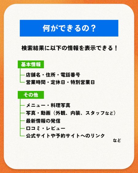・店舗名、住所、電話番号 ・営業時間、定休日、特別営業日 ・メニューや食欲をそそる料理写真 ・外観や内装、スタッフの雰囲気などの写真や動画 ・お店からの最新情報の発信 ・お客様からの口コミやレビュー ・公式サイトや予約サイトへのリンク