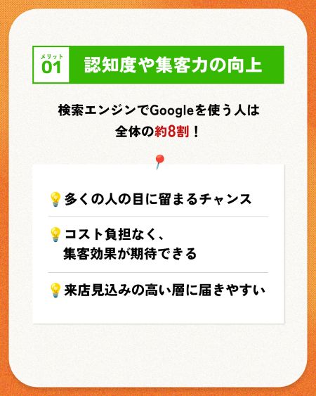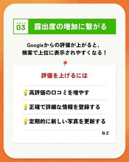 ・高評価の口コミを増やすための丁寧な接客や声がけ ・営業時間や店休日などの情報を常に正確で詳細な状態に保つ ・美味しそうな料理写真や店内の様子を定期的に更新する