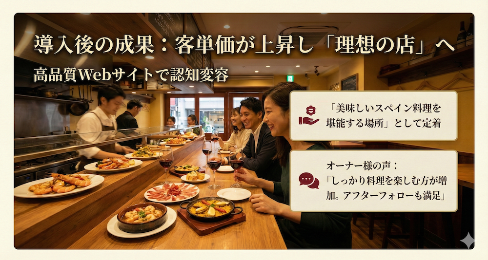 単なる「飲める場所」から、「美味しいスペイン料理を堪能する場所」へと認知が変わったのです。さらに、オーナー様からは「アフターフォローにも満足している」という心強いお言葉も頂いています 。