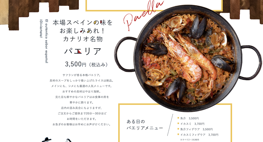 - 「2大名物」の徹底訴求:看板メニューであるアヒージョとパエリアを「2大名物」として定義。プロの写真と専用ページを作り込み、一目で「これが食べたい!」と思わせる仕掛けを作りました 。