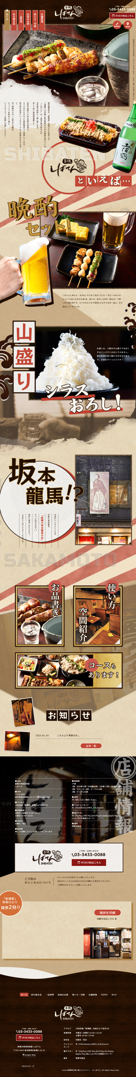 - 名物の焼き鳥やつくね、人気の季節限定カツオのたたきなど、旨い料理とお酒を安価で愉しめるお店です。 山盛りシラスおろしのお通しや外壁の坂本龍馬の看板などインパクトもあり、新橋で高知の地酒と焼き鳥をコスパ良くいただける居酒屋と言えばここ!となるように構成しております。