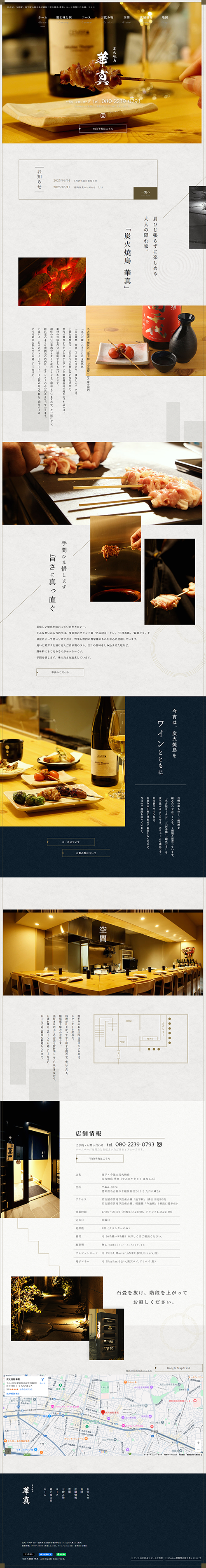 - ブランド鶏を備長炭で焼き上げた上質な焼鳥を、カウンター席で肩ひじ張らずに楽しんでいただきたい。おまかせコースで楽しむ焼鳥ということで敷居の高さを感じている方にも、普段使いやひとり飲みに最適な気軽に過ごせるお店であるとお伝えすることがサイト制作の目的の一つです。
